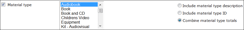 Note: The statistical categories depend on the kind of statistical report you are creating. For example, for an item statistical report, you could report on transactions involving item records, such as check outs, check ins, or modifications to item records.