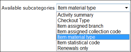 - Select a subcategory. The available subcategories depend on the selected statistical category, and the available filters depend on the selected subcategory. For example, if you select Item material type subcategory for an item statistical report, the only filter available is the material type filter.