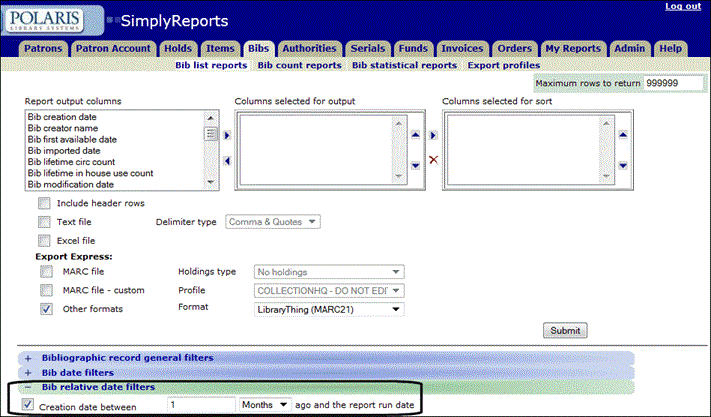 Example: Set up the export criteria to gather all the MARC bibliographic records that were created or imported into the Polaris database within 30 days of the report run date. Schedule the report to export the records to a LibraryThing MARC file once a month. Then, send the updates to LibraryThing.