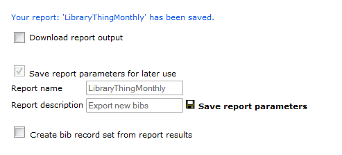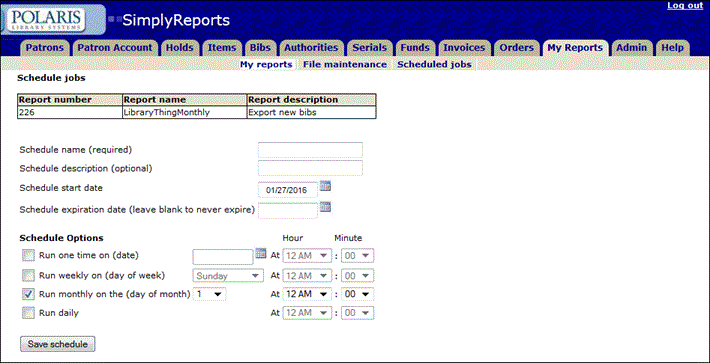 - Click Save schedule. The LibraryThing file will be created on the first of every month containing the titles added within the month previous to the report run date. The file is created and saved to your desktop automatically, but you must send it to LibraryThing according to the company’s instructions.