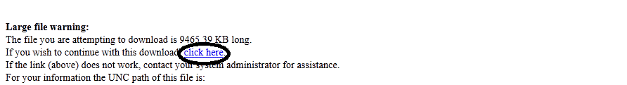 If the report file is large, you may see a Large file warning message. If you want to continue downloading, click the link (click here) in the warning message.